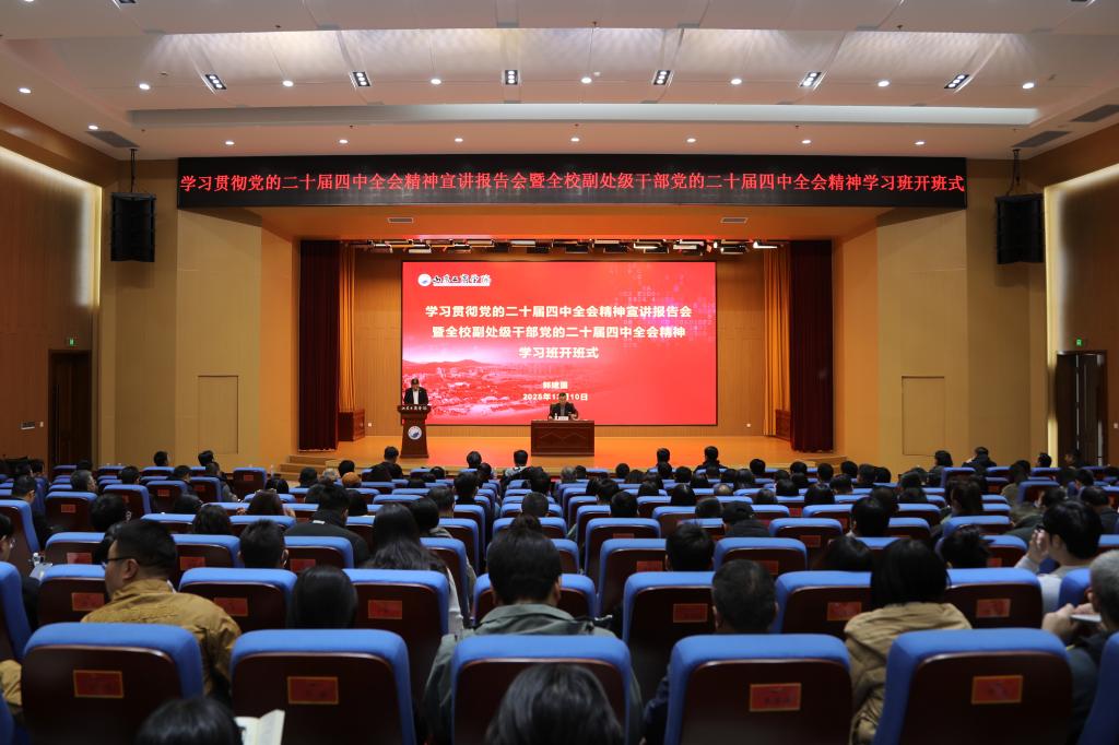 12月10日下午,山东高校学习贯彻党的二十届四中全会精神宣讲团成员、学校党委书记郭建国为干部师生宣讲党的二十届四中全会精神,对全校副处级干部学习党的二十届四中全会精神学习班作开班动员,并为青马班成员讲授思政课。学校党委副书记、院长陶虎主持会议。